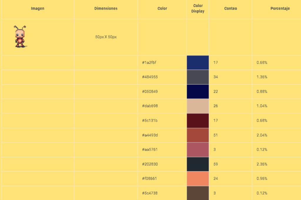 Esta herramienta te permite contar los pixeles de una imagen .png o .jpg con colores indexados. Obtienes el número de píxeles por color en formato hexadecimal, la muestra de color y el porcentaje utilizado por color.