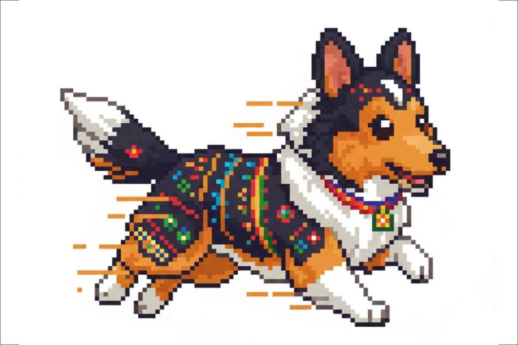 $0.00Plantilla y patrón de píxeles de un perro chihuahua saludando con la pata derecha, sonriendo, feliz, archivo en PDF y archivo editable en XLSX.